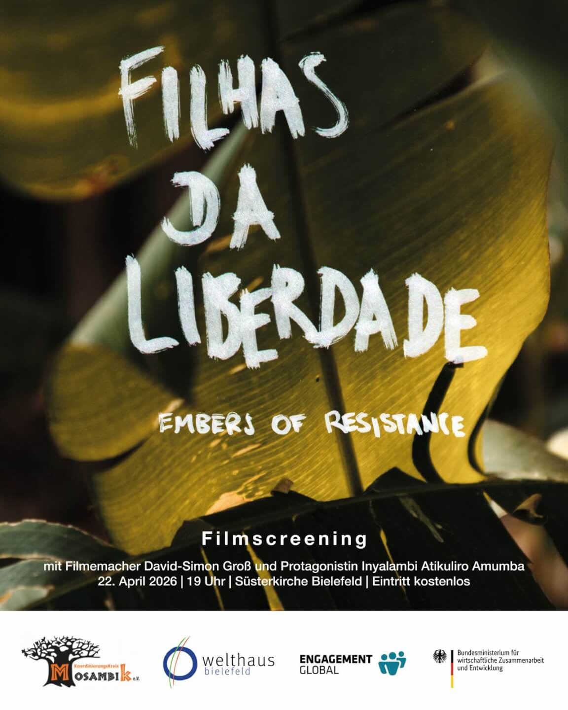Am 22. April um 19 Uhr findet ein Filmscreening in der Süsterkirche in Bielefeld statt. Im Anschluss an den Film gibt es die Möglichkeit mit dem Filmemacher David-Simon Groß und Inyalambi Atikuliro Amumba, einer der Protagonistinnen des Films, zu diskutieren. Der Eintritt ist kostenlos, aber wir freuen uns über eine kleine Spende.